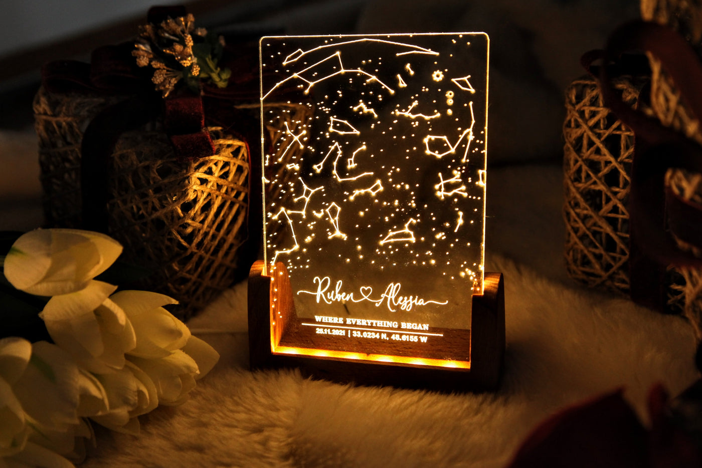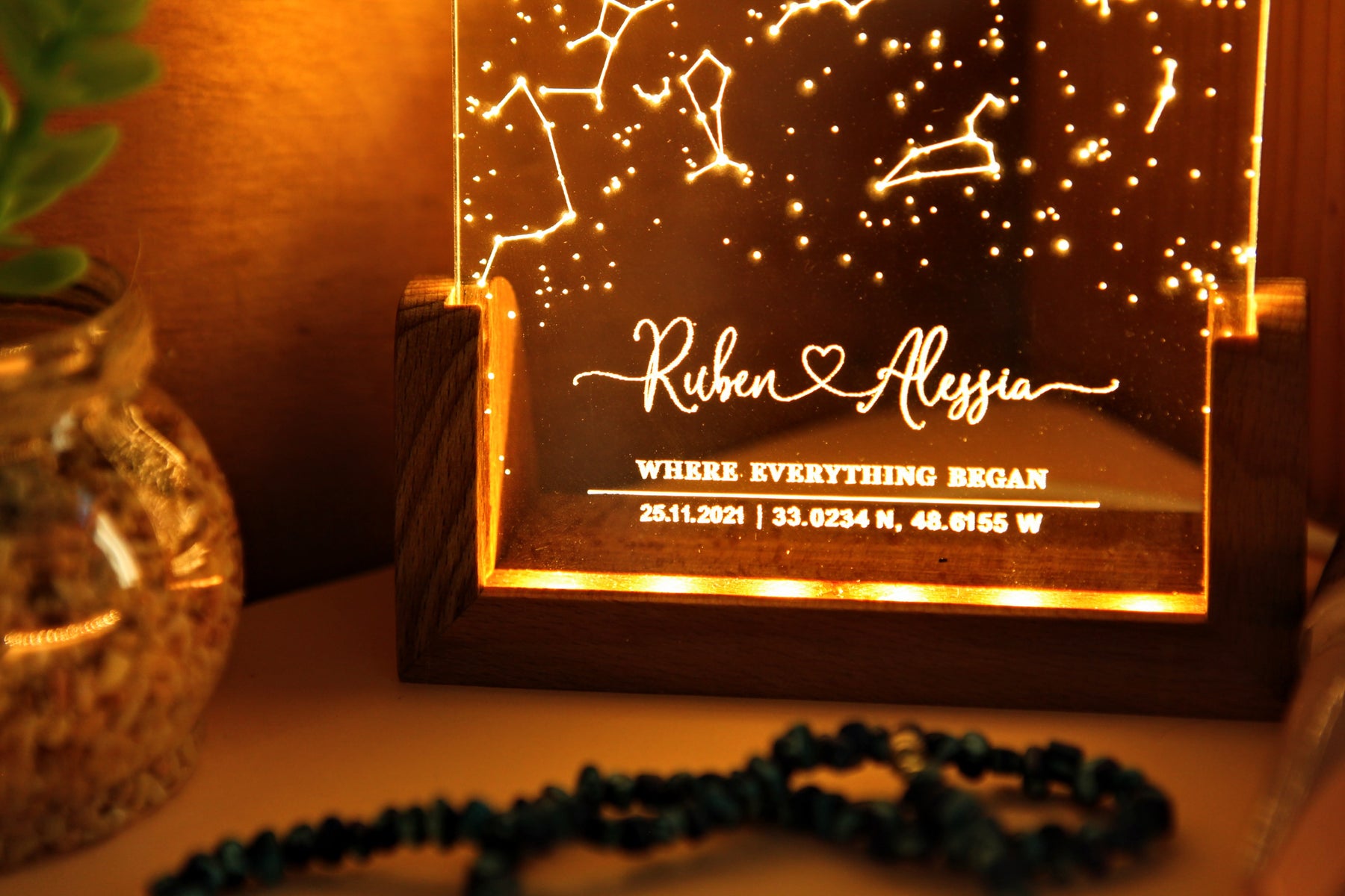 This unique night lamp immortalizes important moments in your life and is a special addition to our collection of personalized gifts that capture cosmic magic. Each star map is carefully designed to reflect the alignment of the stars on a chosen date and location, creating a timeless keepsake for your special day. Our night lamps are not just decorative pieces, but also intricate works of art that bring elegance and lighting to any space. Please note that in order to create your custom star map, we will need the coordinates of a location that holds deep meaning for you.
